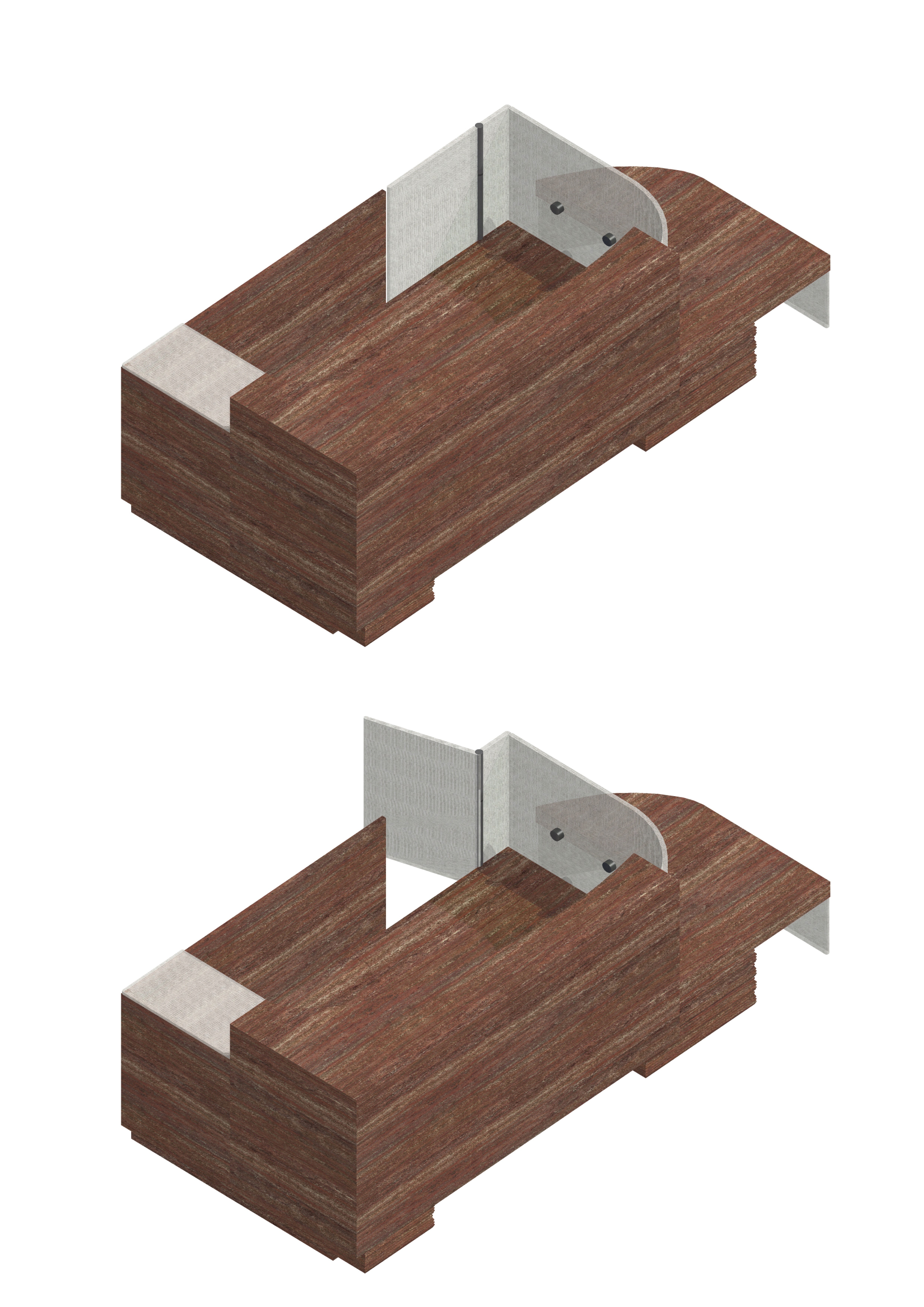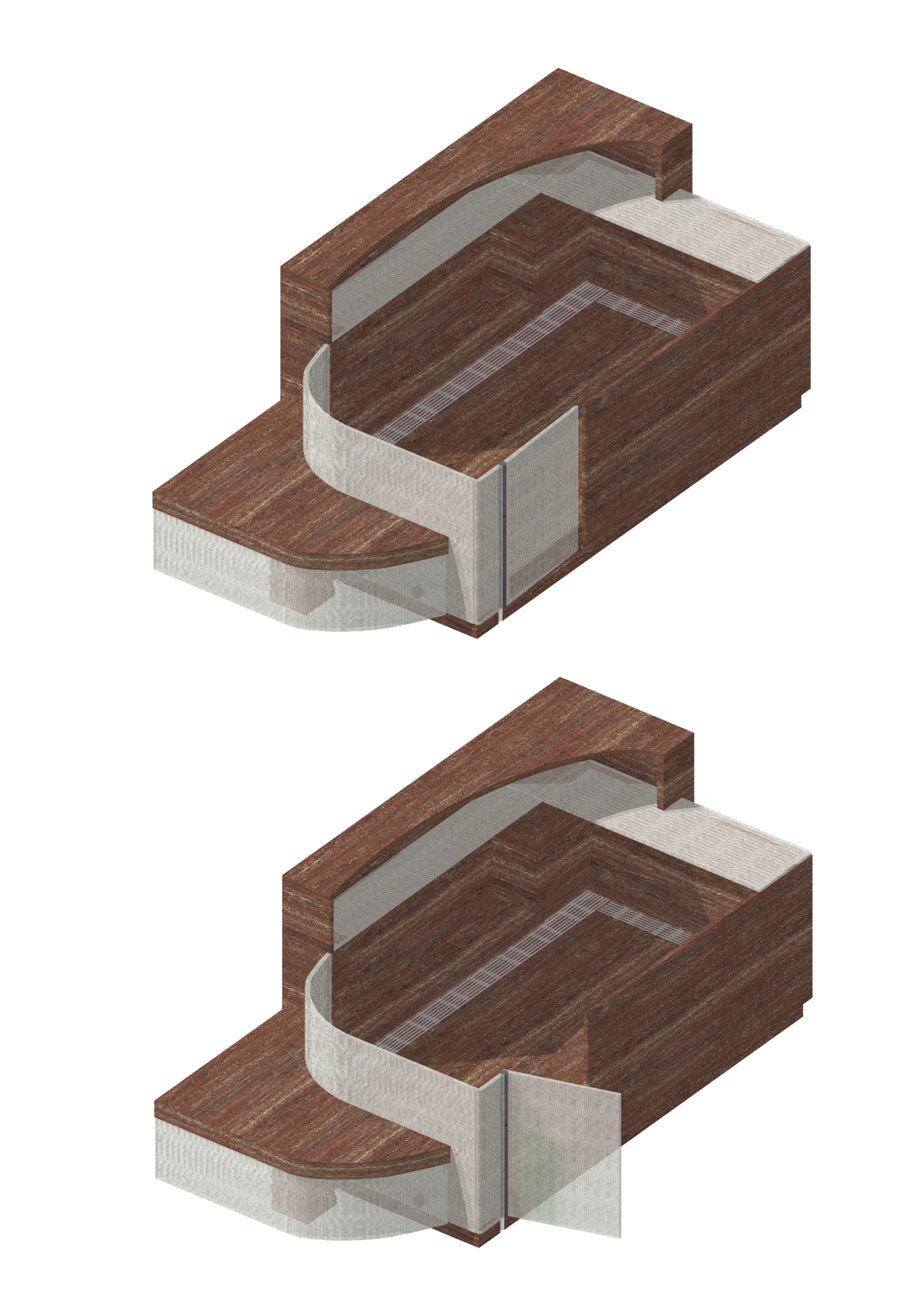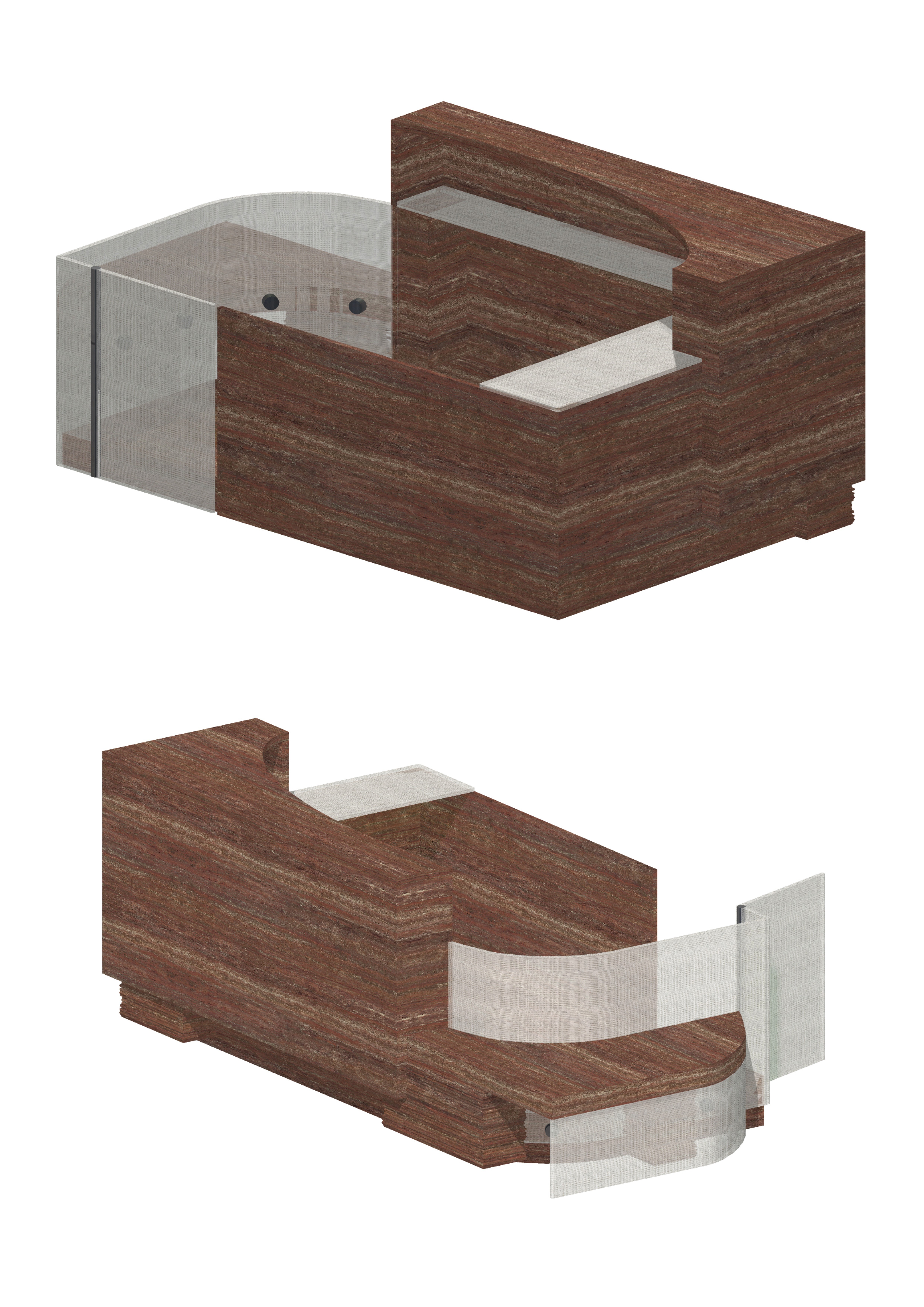 The concept responds directly to an conceptualized glass ceiling sculpture by 6AM Glass that frames the space. In dialogue with this feature, the central element incorporates textured glass components, establishing a material and visual continuity between ceiling and ground.